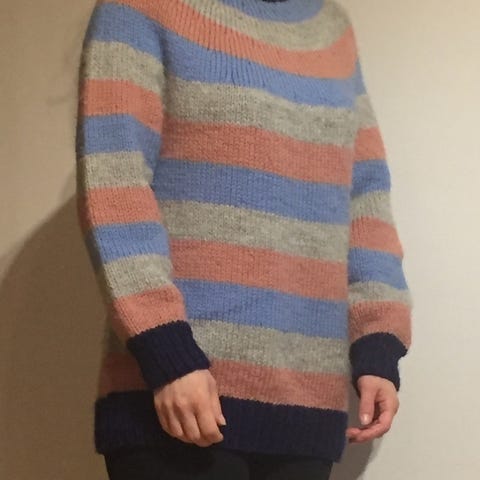 Vaalea/vaaleanpunainen neule, mukana angoraa ja lampaanvillaa. Italiassa valmistettu