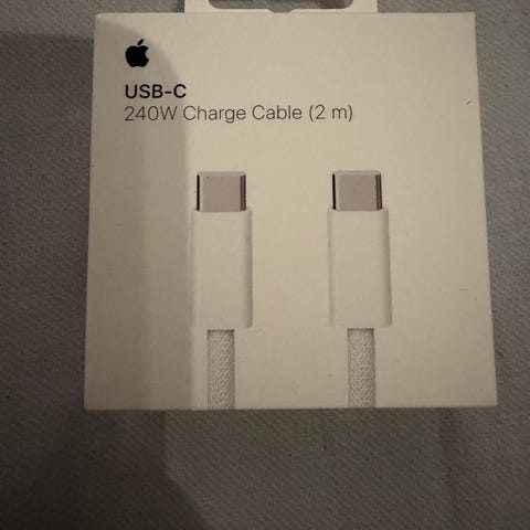 Parin metrin pituinen punottu kaapeli lataukseen, synkronointiin ja datan siirtoon. Latauskaapelin kummassakin päässä USB-C-liitäntä. Tukee peräti 240 W:n latausta sekä pikalatausta.