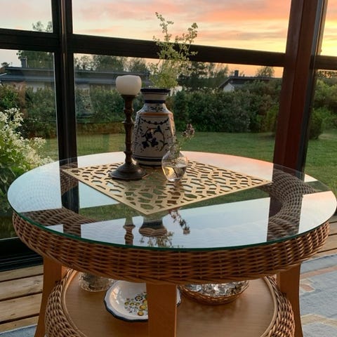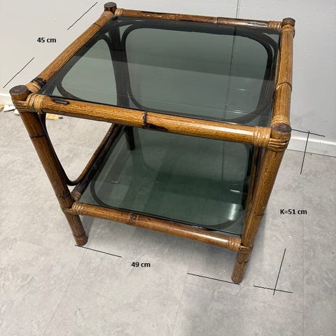Vanhan tuotannon rottinkinen sivupöytä myytävänä. Lasit ehjät. Punokset ja runko ehjä. Aikaan sopivaa patinaa kauttaaltaan. Ei hajuja.