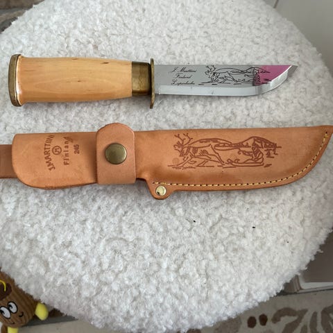 Altti Kankaanpään puukko, tammipuukahva ja nahkatuppi.