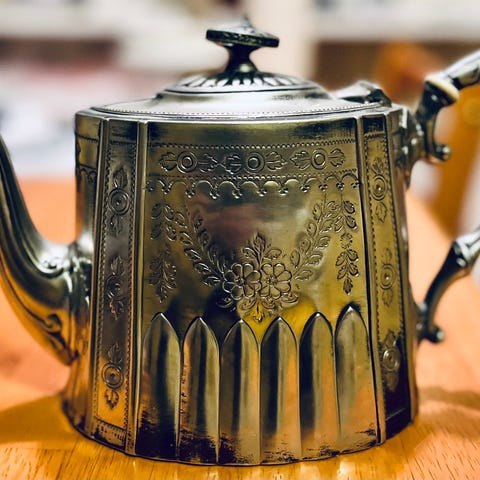 Hopeinen koristekannu, jossa on koristeelliset yksityiskohdat ja ketjusanka. Kannu on pieni ja sopii koriste-esineeksi tai keräilykohteeksi.