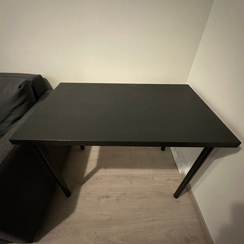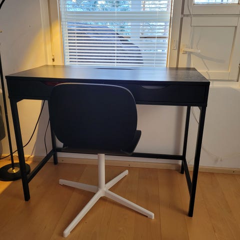 Työpöytä mustalla viilupinnalla ja säädettävällä korkeudella (manuaalinen säätö) . Mukana pyöreä musta työtuoli, jossa säädettävä korkeus ja metallinen jalusta.