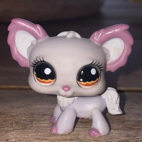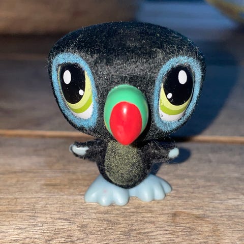 Littlest Pet Shop violetti pingviinifiguuri, jossa suuret siniset silmät ja keltainen nokka sekä jalat. Figuuri on valmistettu muovista.