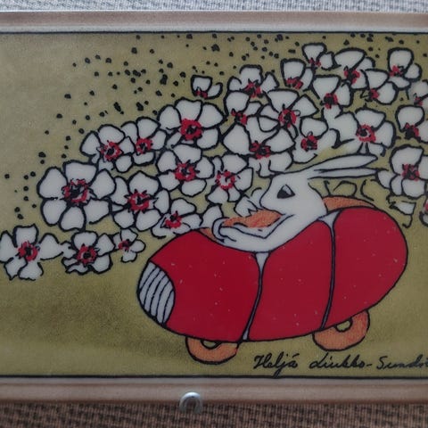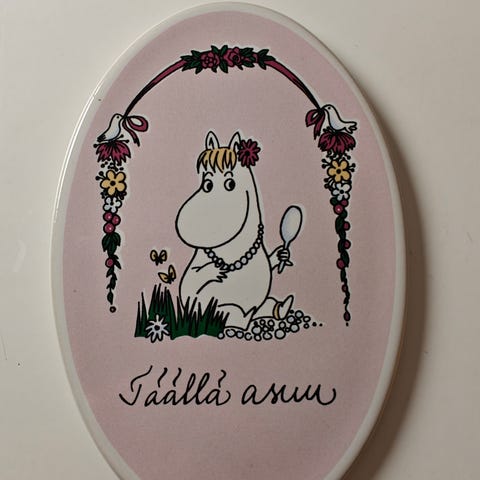Arabia koristeellinen seinälaatta, jossa vaaleanpunainen tausta ja niiskuneiti koristeena. Laatta on ovaalin muotoinen ja siinä on teksti 'Täällä asuu'. Käytetty koriste-esine sisustukseen.