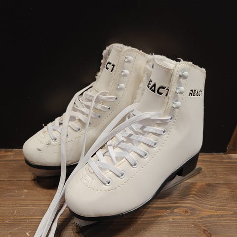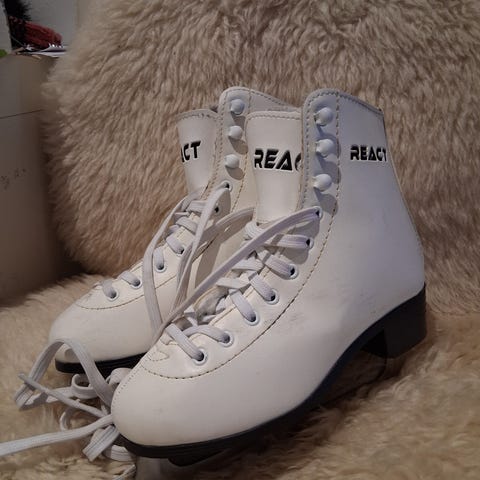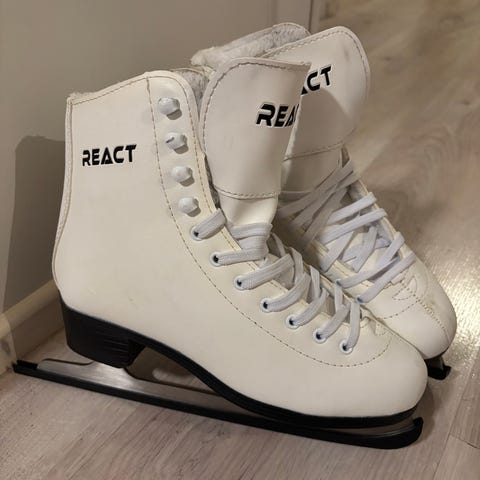 React lasten luistimet, koko 33. Muuten kunto moitteeton, mutta parin käyttökerran jälkeen jäänyt mustia jälkiä luistimen pintaan. Karvavuori ja pohjallisen pituus 21 cm.