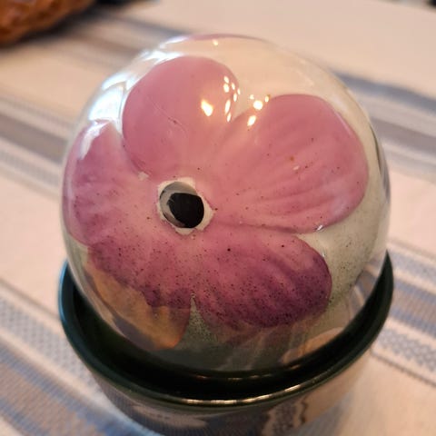 Alkuperäisessä laatikossa säilytetty käyttämätön ikikukka. Alaosassa värivirhe lasitteen alla. (Kts. kuva)