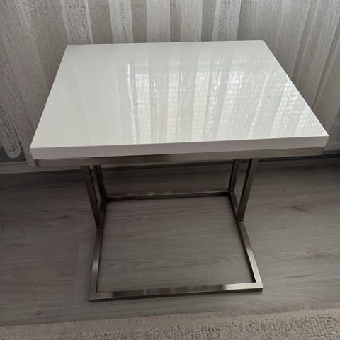 Valkoinen sivupöytä kahdella laatikolla. Hyvässä kunnossa, pari virhettä löysin mutta ei juuri mitään näkyvää. Laatikot toimii ja kunnossa kaikin puolin.