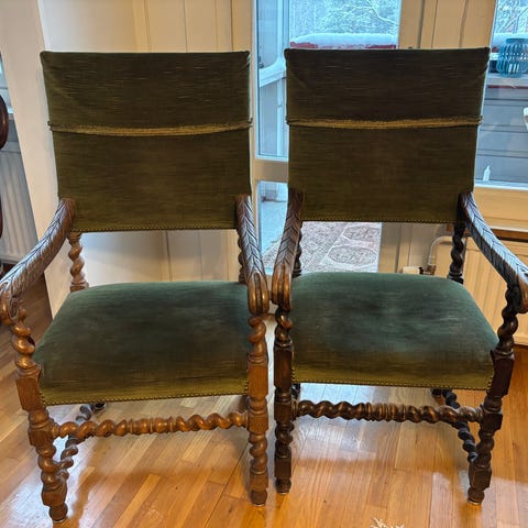 Kaksi barokkityylistä nojatuolia, joissa on koristeelliset kaiverrukset ja punainen verhoilu. Tuolit ovat massiivisia ja näyttäviä, ja niissä on korkeat selkänojat.