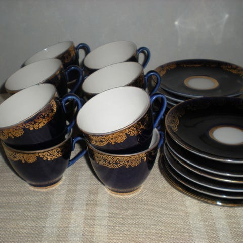 Koboltinsiniset lomonosov kahvikupit 7 kappaletta. Yksi kupeista hiukan pienempi kuin muut. Yhdessä sisällä lasitteessa viiva, kuppi muuten ehjä.