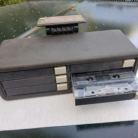 Boxette-merkkinen viiden kasetin teline. Mitat 2x10,5x34 cm. Kiinnitys jousilla vaikka hanskahyllyn reunaan. Noutokin käy.