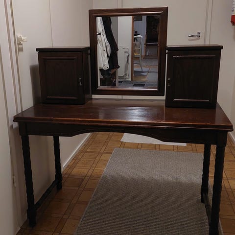 Puinen peilipöytä ja siihen kuuluva jakkara