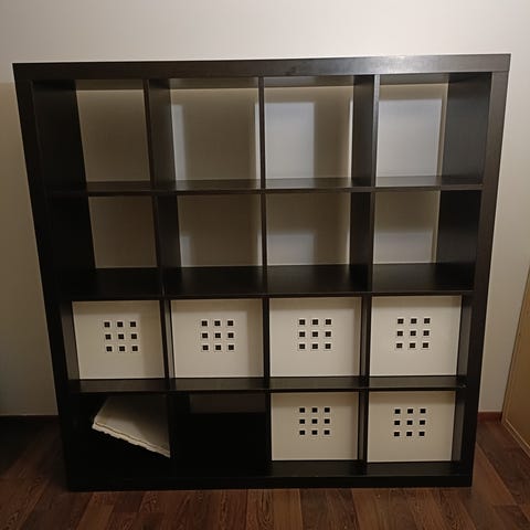 Siisti kerran koottu IKEA Kallax hyllystö, väri valkoinen. Hyllystössä on useita neliönmuotoisia lokeroita, jotka soveltuvat esimerkiksi kirjojen, kansioiden, laatikoiden tai koriste-esineiden säilytykseen. Rakenne on suorakaiteen muotoinen ja se voidaan sijoittaa seinää vasten. Materiaali on puupohjainen levyrakenne, jossa on sileä, maalattu pinta. Nouto Nöykkiöstä, ostaja hoitaa purun.