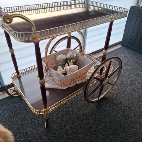Tarjoiluvaunu, kärry. Musta mäntyvaneri. Kansi ollut meillä irti alahyllyllä. Kestävä hyvä kärry. Myyn tilan puutteen ja pikkutulojen vuoksi. Osina varastossa. Hinta uutena 129€