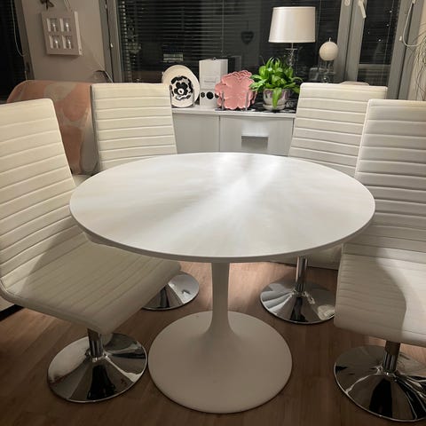Hyväkuntoinen valkoinen ruokapöytä tammi jaloilla. Päällys osan saa irti. Halkaisija 110cm. Vain nouto!