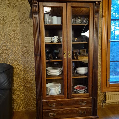 Laadukas, vanha täyspuinen seinäkaappi tammea. Painava ja jykevää tekoa. Ehjä ja siisti. Avain tallessa mutta otin on katki, ovi toimii ilmankin.