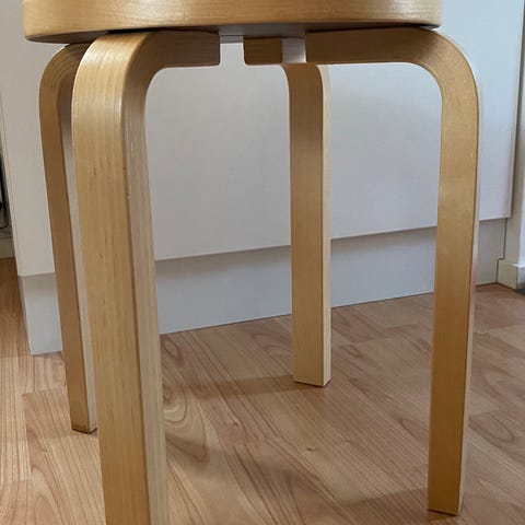 Koivujalat + reunat todella siistit, oikeastaan virheettömät. Jos jonkin "virheen" haluaa löytää, niin mikroskoopilla katsottuna yhdessä kohdassa on pieni rako istuinosan ja reunan välissä (kts. viimeinen kuva). Paljaalla silmällä ei käytännössä huomaa, niin kuin muista kuvista voi sen todeta.