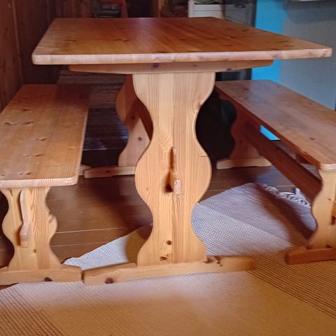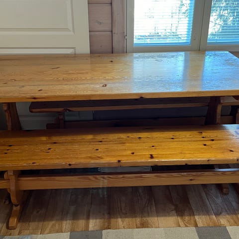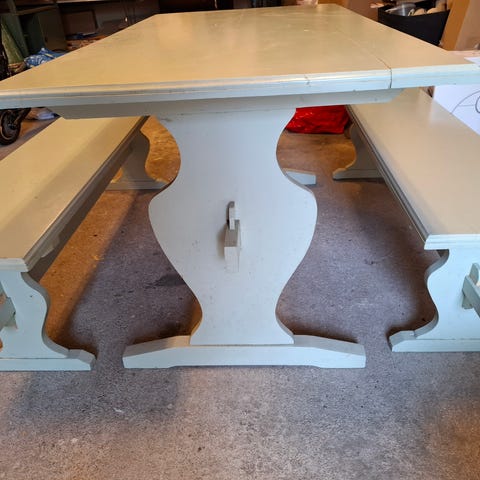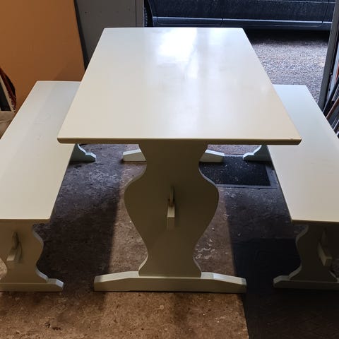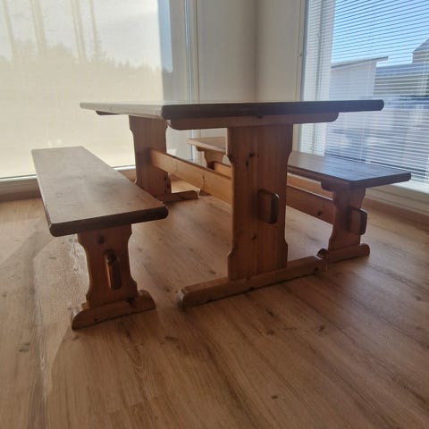Käytetty koivunen valkoinen pirtin pöytä ja penkit. Käytönjälkiä on.