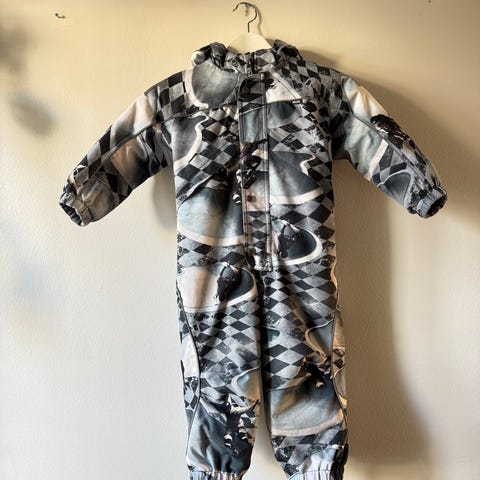 Yhdellä käytetty Molo Polaris Fur dreamy horses toppahaalari koossa 98. Polvissa ja pepussa luonnollisesti käytön tuomaa pehmentymää, pitänyt meillä edelleen kuivana ja lämpimänä. Muuta pientä tavanomaista kulumaa siellä täällä mutta yleiskuva siisti käytetty.