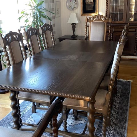 Antiikkipöytä (sisältää jatkopalan) ja viisi tuolia. Nouto Ristinarkusta.