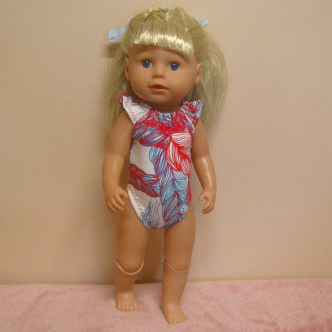 43 cm nukelle (baby born tai sister) trikoosta pallollinen uimapuku. Edestä ja takaa samanlainen. Helppo pukea, pääntien röyhelössä kuminauha.