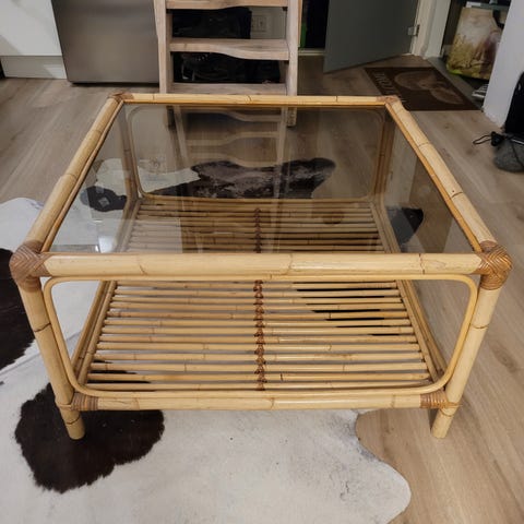 Uniikki rottinkinen sohvapöytä. Pöydän alaosa toimii erinomaisesti esimerkiksi lehtitelineenä! Pieni kulumakohta toisessa sivussa pöytää, joka näkyy viimeisessä kuvassa.