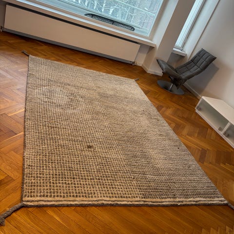 Myyntiin muuton edetessä kuvan Woodnotesin Grid-mallin villamatto koossa 200x300. Ostettu muutama vuosi sitten Vepsäläiseltä. 90% villaa, 10 % puuvillaa. Kämmenen kokoinen tahra, mikä näkyy kuvissa. Pinnan elävyys häivyttää kuitenkin tahraa hyvin. Nouto Munkkiniemestä. Hp. 700 e (ovh. 1770 e). Mmm.