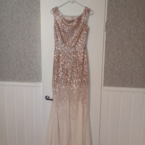 XS - M koon juhlapuku. Kerran käytetty. Puvun takaosassa satiini nyöritys millä voi säätää vyötärön ja rinnan alueen mitoitusta. Ollut 180cm tytöllä. Helppo kuitenkin lyhentää. Vannehametta ei ole.