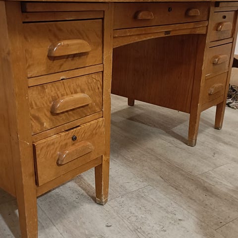 Hakusanat: työpöytä, kirjoituspöytä, toimisto, toimistopöytä, huonekalu, huonekalut, työ, kirjoitus, konttoripöytä, laatikot, käytetyt huonekalut, vintage huonekalut, puu, vintage, pöytä