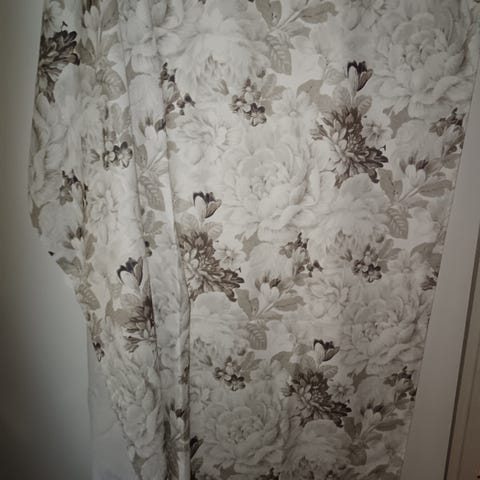 Harmaat (3 kpl) ja kukalliset (2 kpl) ohuet pitkät verhot. Harmaat 7 euroa kaikki yhteensä, kukalliset 5 euroa. Tai kaikki 10 euroa.
