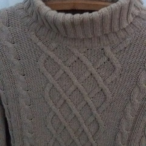 Beige neulepusero miesten XL-koossa. Valmistettu neulotusta materiaalista, jossa on erilaisia neulospintoja ja korkea kaulus.