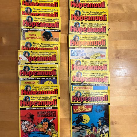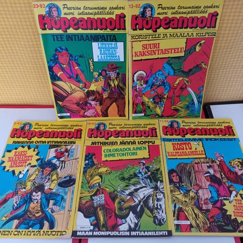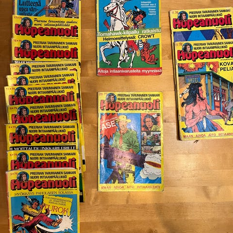 Hopeanuoli sarjakuvalehtiä keräilijälle, klassinko sarjakuva joka kertoo preerian tarumaisesta sankarista, nuoresta intiaanipäälliköstä. Lehdeet ovat täynnä seikkailuja ja jännitystä, kuten 'Kilpajuoksu kuoleman kanssa' ja 'Tonka-intiaanien salaisuus'. Tämä lehti on osa laajempaa kokoelmaa, joka vie lukijan villin lännen maailmaan. Tyydyttävä kunto yleisesti. Osa hyvässä kunnossa, osasta puuttuu kansi. Mukana myös muutamia ylimääräisiä lehtiä. Sisältää:1976: lehdet 1-111977: lehdet 1-27 (numero 21 puuttuu)1978: lehdet 1-25/26 (numero 10 puuttuu)1979: lehdet 1-24 (lehdestä 1 puuttuu kansi)1980: lehdet 1-241981: lehdet 1-24 (numero 2 puuttuu)1982: lehdet 1-241983: lehdet 1-33 (numerot 20, 21, 27 puuttuvat)1984: lehdet 1-52 (muutamia puuttuu)1985: lehdet 1, 4-6, 8, 13, 16, 18BONUS: Taskukirja 1 Pettureiden yö