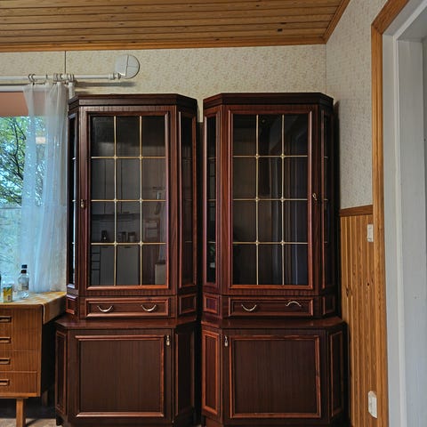 Myynnissä matala 180 cm leveä vitriini. Lasiset liukuovet ja hyllyt. Nähtävillä Paimiossa.