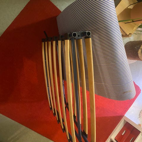 Pari poikkupuuta halki, ei haittaa käyttöä, teipattu ilmastointiteipillä. Lukitus kiinni ollessa puuttuu, laitettu oranssilla narulla kiinni, jos välissä on patja. Ei vaikuta nukkumiskäyttöön.
