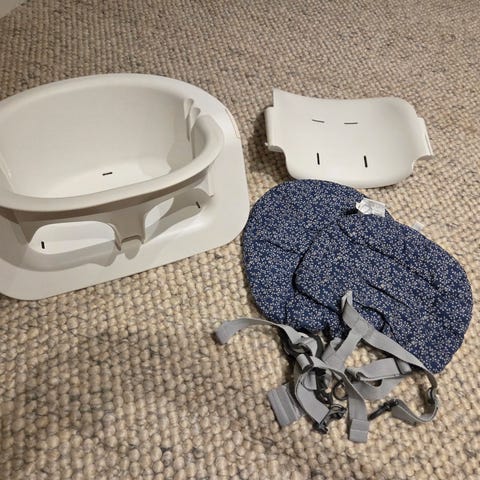 STOKKE steps merkkinen syöttötuolin osa + tarjotin. Tarjottimen saa irti. Tullut meille käytettynä. Siisti ja ehjä. Kankaisen pehmusteen saa irti. Myyn 50e tai vaihdan stokken tripp trapp merkkiseen tarjottimeen.