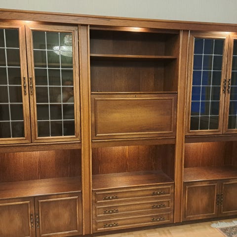 Täyskoivuinen vitriini/kirjahylly. Vitriiniosan molemmilla puolilla on kirjahyllyt, jotka voidaan laittaa myös vierekkäin. Matalasta kaapista yksi nuppi irti, vitriinissä valosarjoille mahdollisuus.