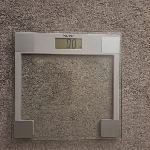 Beurer henkilövaaka, jossa on digitaalinen näyttö ja lasinen pintamateriaali.