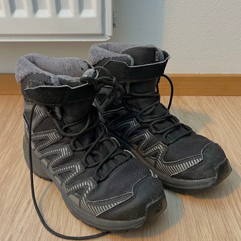 Salomonin mustat lasten varrelliset talvikengät, koko 33. Pohjissa contagrip-pinnoite, joka tekee kengästä paremman jäällä ja liukkaalla kuljettavan. Sopivat mielestäni sekä tytölle että pojalle.