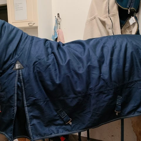 Finntack laivastonsininen toppaloimi 300g 145cm puolikorkealla kaulalla. Kaikin puolin ehjä ja siisti, olikin meidän mammutille liian paksu joten ei ole montaa päivää pidetty. Myydään pestynä ja kyllästettynä.