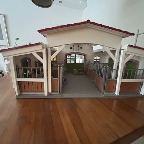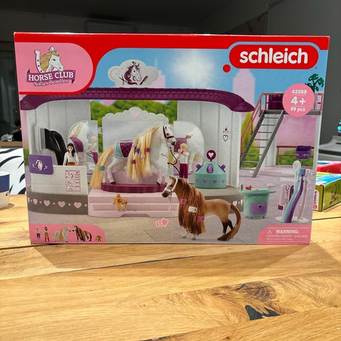 Lapseni myy Schleich-talliaan. Mukana pelkkä talli + pienet juomakupit ja varustetelineet. (Ei siis aitapaloja tai muita härpäkkeitä).