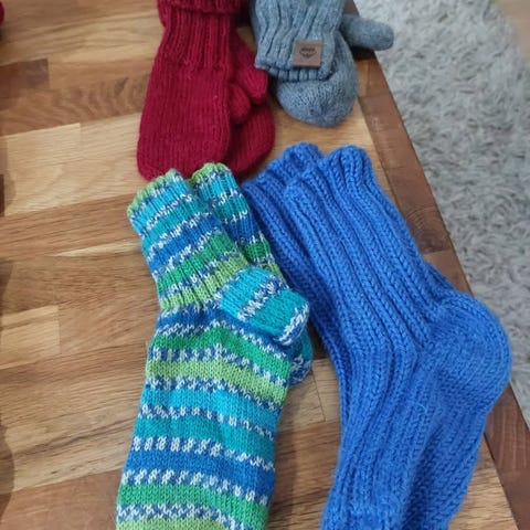 Vähänkäytetyt lapaset ja villasukat. Sinikirjavien villasukkien kärki-kantapituus 17 cm, ruskeankirjavien 16 cm. Viininpunaisten lapasten pituus kärjestä ranteeseen 11 cm, koko pituus 17 cm. Kirkkaanpunaisten lapasten pituus kärjestä ranteeseen 11 cm, koko pituus 23 cm. Kirkkaanpunaiset lapaset oikein pehmeät, luultavasti alpakkaa. Taloudessa ei eläimiä eikä sisäilmaongelmia. Nouto Metsokankaalta tai kulkeutuu omien menojen mukaan Kontinkankaalle. ToriDiilissä toimituskulut ostajalle. Katso myös myyjän muut ilmoitukset.