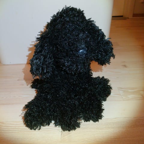 Pehmoinen koiranpentu. Ehjä ja siisti, mutta pesu jää ostajalle. Pituus 27 cm ja leveys etutassujen kohdalla 20 cm.