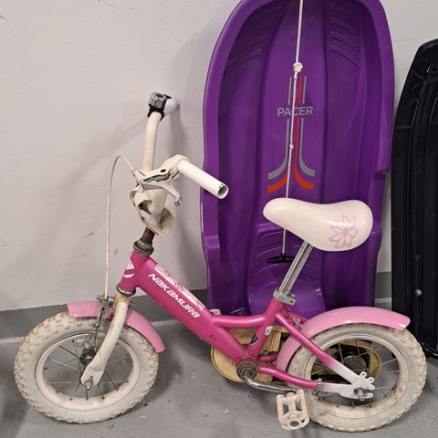 Lasten ensipyörä / pyörä / kolmipyörä taaperolle. Aikuinen voi työntää tätä aisalla tai harjanvarrella, paikka kiinnitykselle löytyy. Paljon ajettu, mutta ehjä.