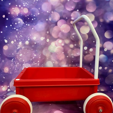 Plasto lasten kärry musta, jossa neljä pyörää ja valkoinen työntöaisa. Kärry on valmistettu muovista ja soveltuu lasten leikkeihin ja tavaroiden kuljettamiseen.