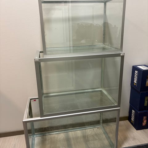 Lasinen terraario jonka leveys 65, syvyys 40 ja korkeus 35.
