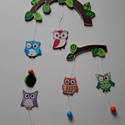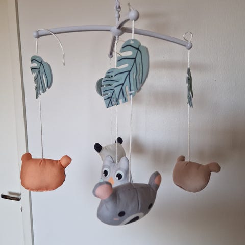 Lasten kehtomobile, jossa on pehmeitä eläinhahmoja ja värillisiä palloja. Mobile on valmistettu pehmeästä materiaalista ja soveltuu vauvan sänkyyn. Yhtää kohtaa liimattu, mutta pysyy ilmankin. Käännettävä soittorasia. Nouto!