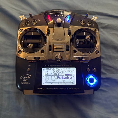 Aikoinaan kisasta voitettu Futaba T4YF radiolähetin. Jäänyt siitä suoraan käyttämättömäksi, suojamuovitkin osittain paikallaan vielä. Pakettia ei taida enää olla.