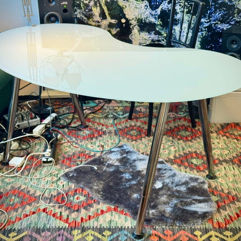 Lasi sumennettu, ehjä ja naarmuton. Metalliset jalat ehjät ja hyvässä kunnossa. Metallirungossa pientä normaalia kulumaa.