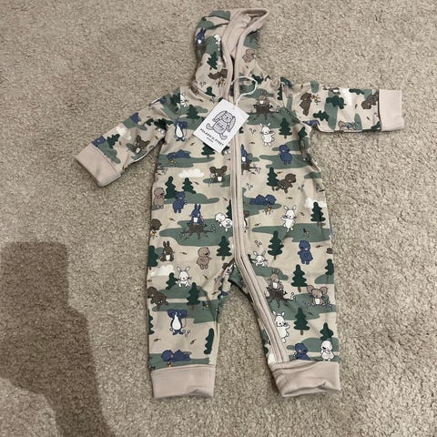 Polarn O. Pyret Kirjava unisex vauvan haalari koko 56 cm, valmistettu puuvillasta. Vaatteessa on vetoketju edessä ja se sopii 1-2 kuukauden ikäiselle lapselle.