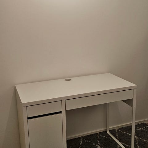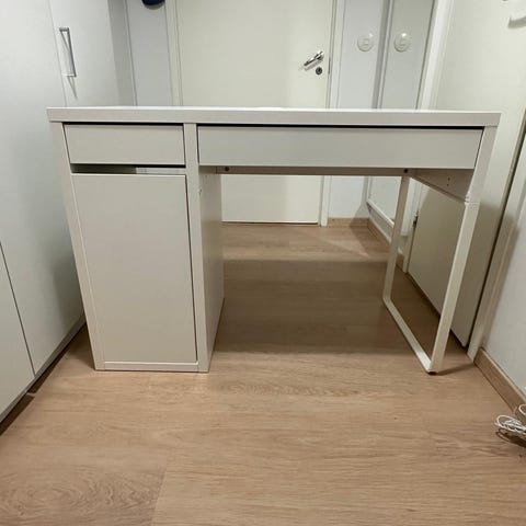Ikean valkoinen Micke työpöytä. Pientä kulumaa ja käytön jälkiä löytyy (kts. kuva), mutta siisti kunto. Kuljetus onnistuu lisämaksusta pk-seudulle.