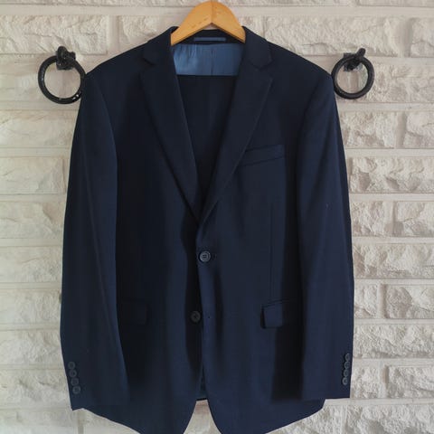 Dressmannin miesten puku. Harmaa pohjaväri, jossa siniset ruudut. Kangas 50% villa, 50% polyester. Takin koko 48 long slim fit, housut W32 L32 slim fit. Kuin uusi. Ovh 249e.